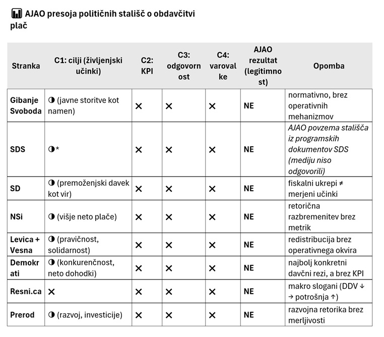 NOVO (8.2.2026): Članek (dejansko povzema spodaj zapisano + podaja predlog besedila koalicijske pogodbe po volitvah.....ki bi zagotovila, da postane OBLAST odgovorna), ki povzame bistvo te analize in podrobneje prikaže tudi BESEDILO koalicijske pogodbe po volitvah 2026, ki bi zagotovila človeku, da bi preverjal USPEŠNOST OBLASTI. Slika spodaj prikazuje rezultate dela AI analitika javne oblasti, ki je presojal "ali politične stranke zagotavljajo LEGITIMNOST svojih programov z vidika "problematike obdavčitve plač".