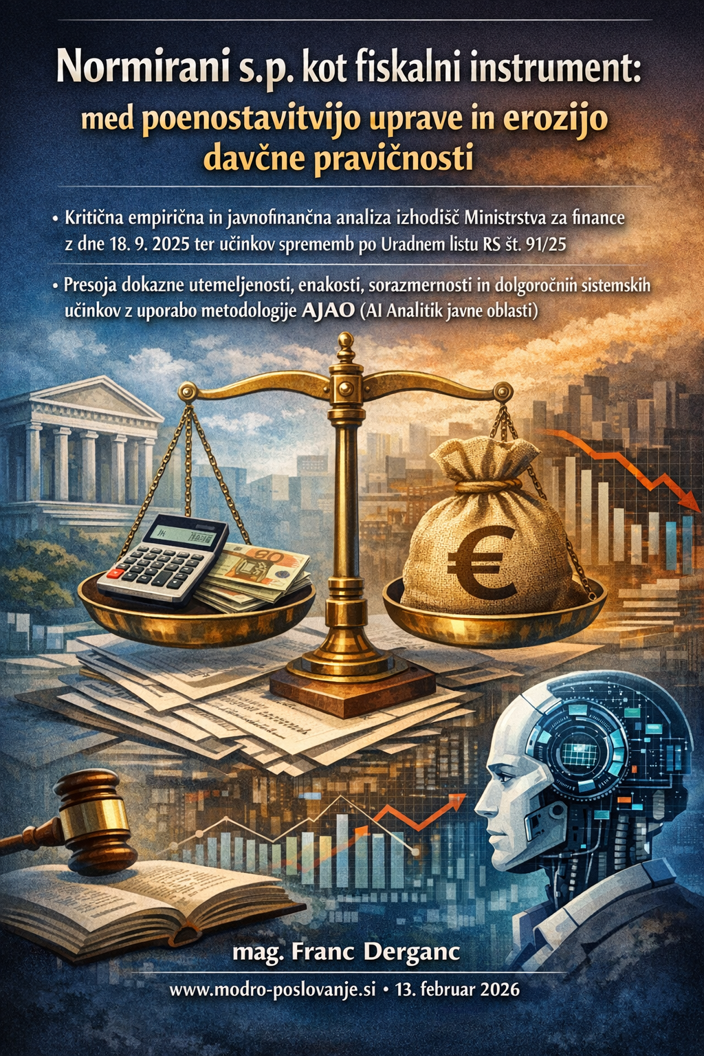 Članek je pripravljen kot neodvisna strokovna in sistemska presoja na podlagi javno dostopnih virov in podatkov, veljavnih na dan 13. 2. 2026. Temelji na analizi dokumenta Ministrstva za finance z dne 18. 9. 2025, sprememb zakonodaje, objavljenih v Uradnem listu RS št. 91/25, uradnih statistik Finančne uprave Republike Slovenije ter veljavne davčne in socialne zakonodaje (ZDoh-2, ZPIZ-2, ZUPJS), ob upoštevanju mednarodnih standardov dobre regulacije (OECD, ISO 31000, COSO ERM).