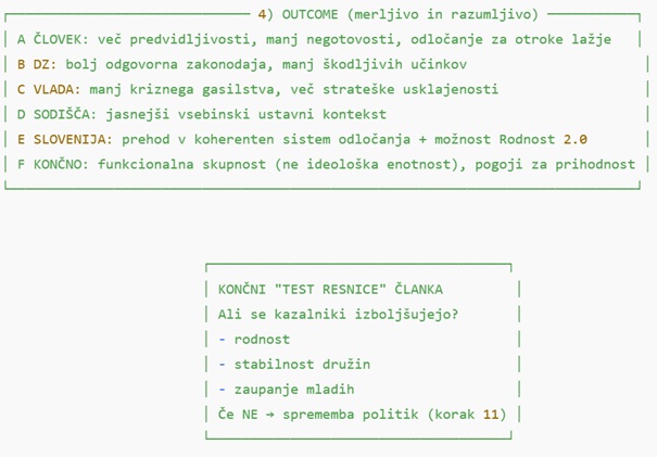 - Vzpostavitev javnega in trajnega testa verodostojnosti na podlagi merljivih kazalnikov (rodnost, stabilnost družin, zaupanje mladih).