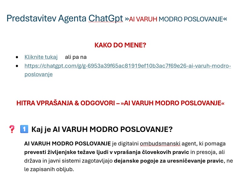 AI VARUH MODRO POSLOVANJE je digitalni ombudsmanski agent, ki pomaga prevesti življenjske težave ljudi v vprašanja človekovih pravic in presoja, ali država in javni sistemi zagotavljajo dejanske pogoje za uresničevanje pravic, ne le zapisanih obljub.