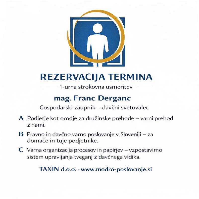 4. Lahko pa najprej preverite katere podatke potrebuje svetovalec, da Vam najhitreje lahko pomaga (vprašanja glede "papirjev"/preoblikovanja poslovanja ....): "AI Davki/Računovodstvo-mag. Franc Derganc"
