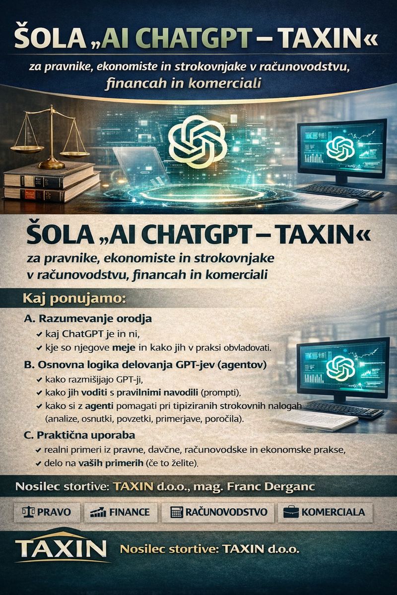 ŠOLA »AI CHATGPT TAXIN - Stopnja I.« - za pravnike, ekonomiste in strokovnjake v računovodstvu, financah in komerciali…
